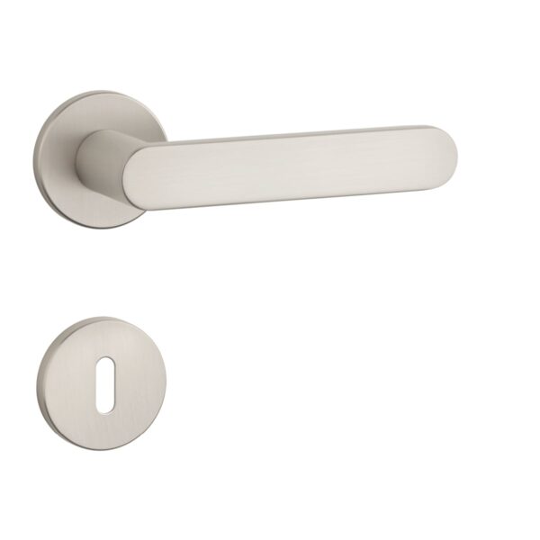 Rozetová kľučka na interiérové dvere s okrúhlou rozetou je vyrobená z materiálov vysokej kvality – zamak a je povrchovo upravená. Rozeta má priemer 52 mm a hrúbku len 7 mm. Minimalistický dizajn rozety s vysokou stabilitou kľučky na dverách pôsobí jemne, a tým ponecháva priestor pre vyniknutie dizajnu samotnej kľučky.